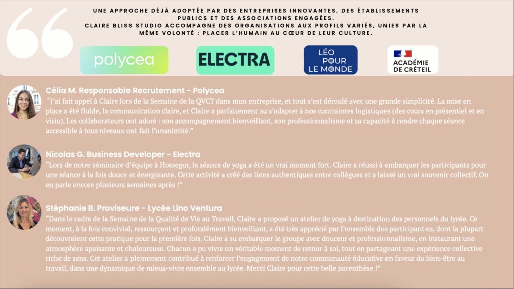 Claire Bliss Studio accompagne les entreprises dans leurs enjeux RH actuels : rétention des talents, gestion du stress, lutte contre la sédentarité et renforcement de la cohésion.